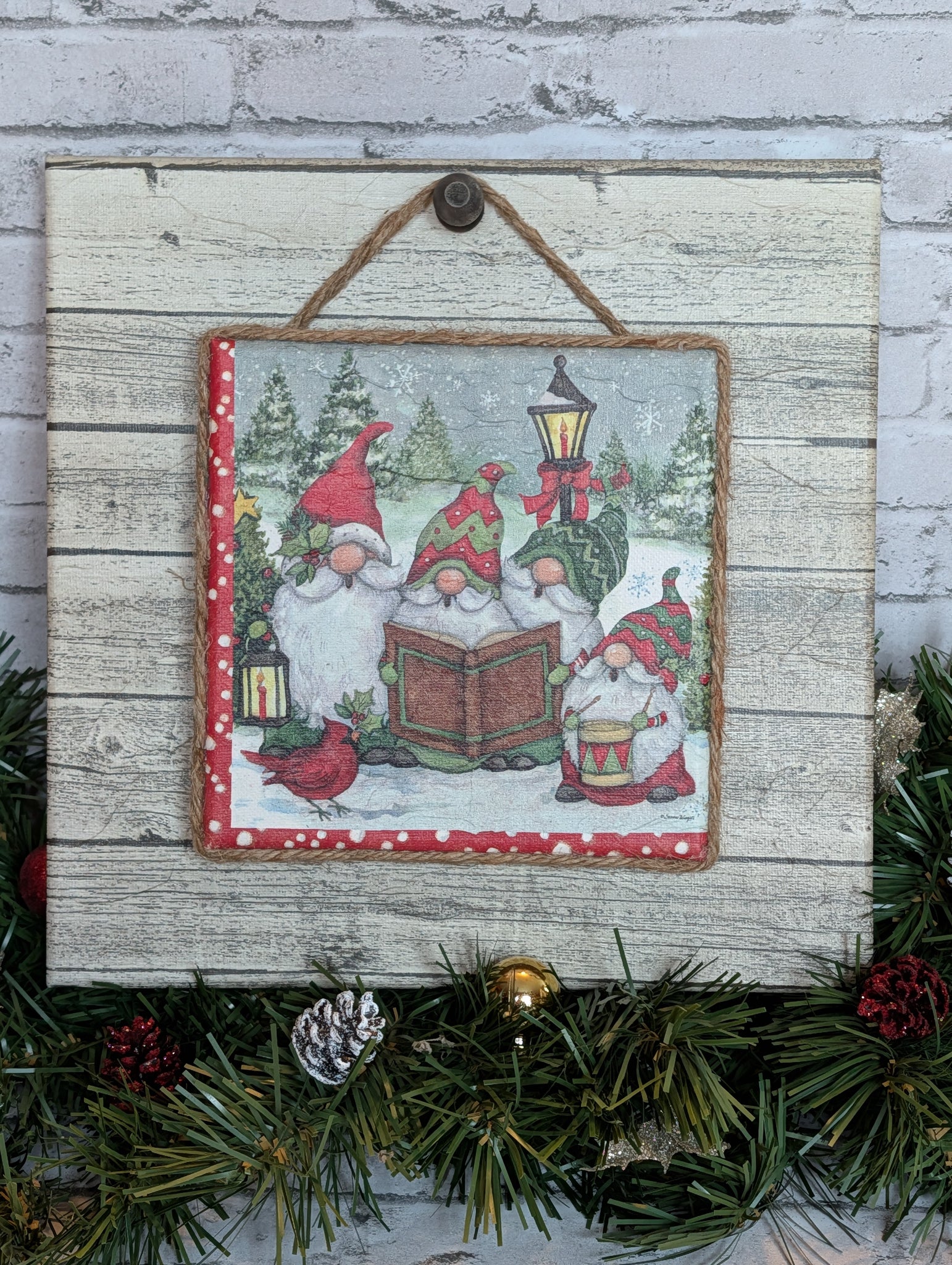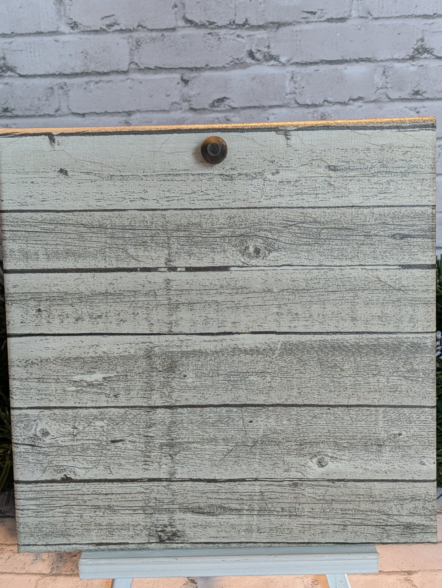 This canvas we designed specifically to display a smaller piece. We decoupaged it with a woodgrain look for a neutral backdrop to go with any color or season. Then we added the small hanging knob at the top.