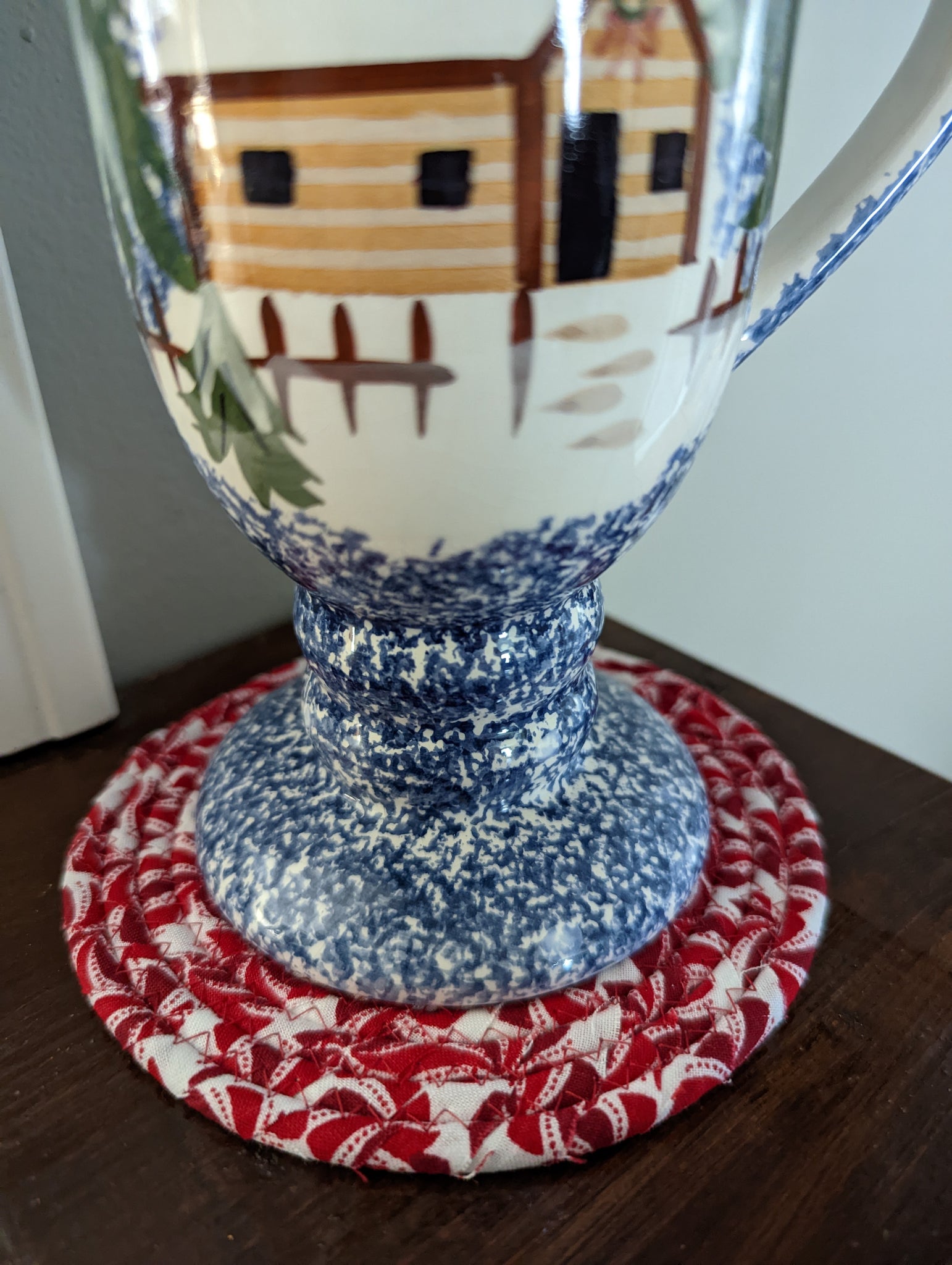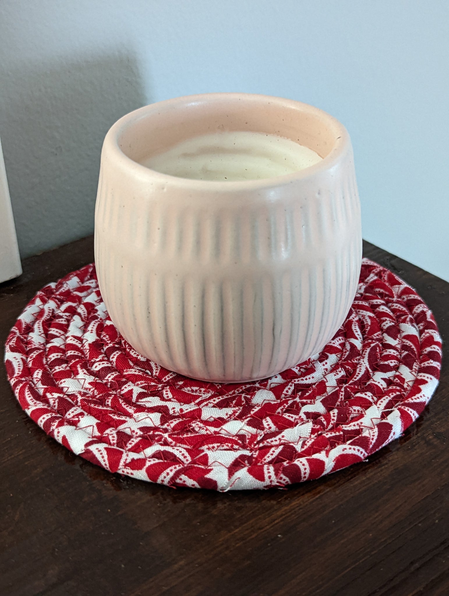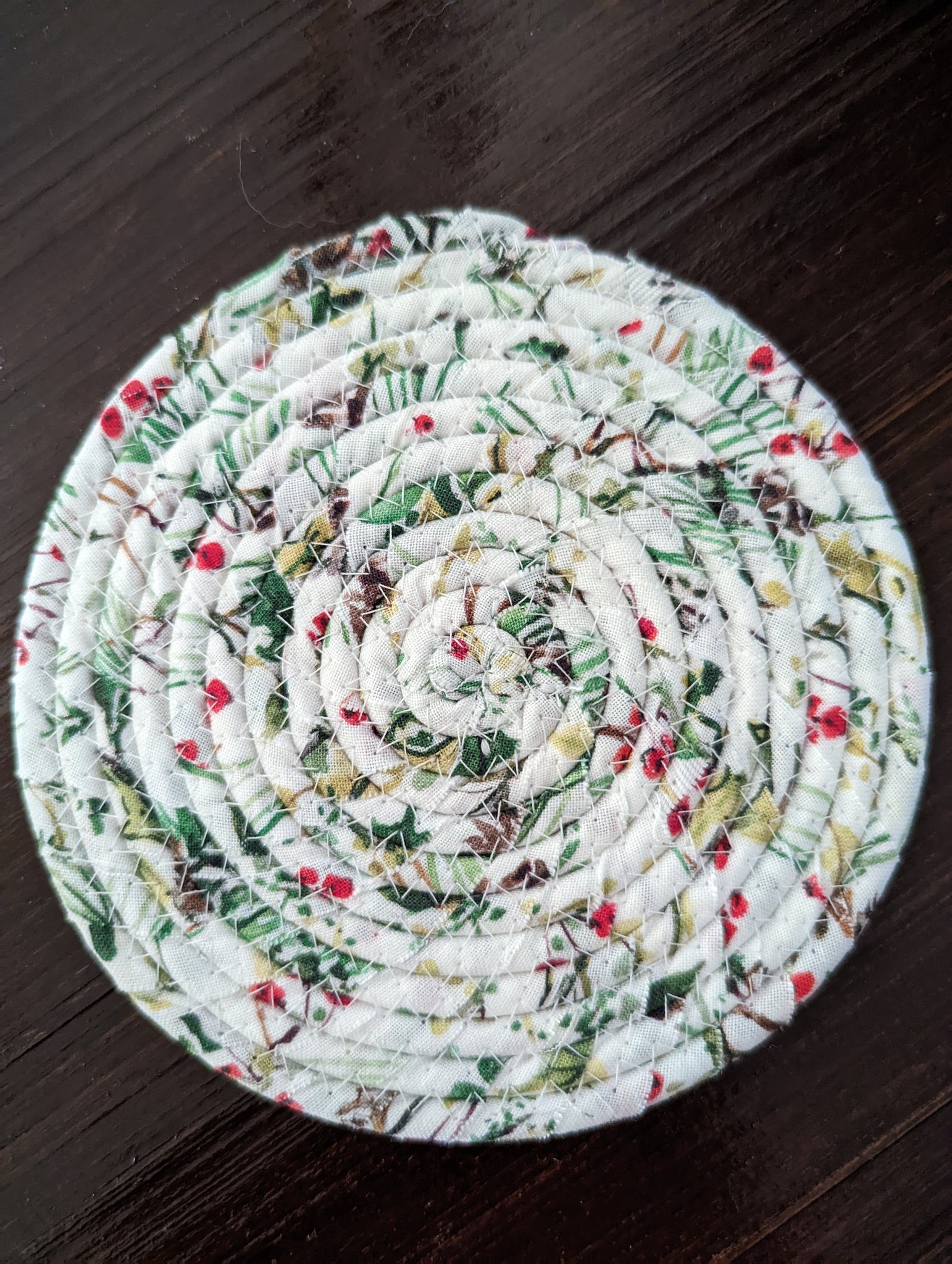 It's a coaster, but we think "Mug Rug" is way more fun!  We hand wrap cord clothesline with cut strips of fabric and then shape it into a decorative rug to sit your mug.  Or your glass, a candle, a candy dish - sit whatever you want on it!  We zigzag stitch the wrapped cord with coordinating thread that adds a rustic, natural look.