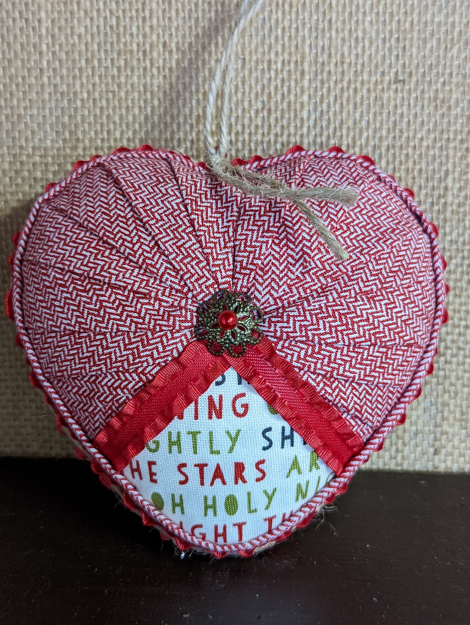 This charming ornament is created with rustic country fabrics and a beautiful "O Holy Night" print highlighted at the bottom of a heart shape.  We dressed the pattern up with ruffled ribbon around the heart and a medley of charms dangling from the center front, including a wooden star, a shiny jingle bell and an antique bronze heart with a sweet jute bow.  The opposite side of this ornament has a simple bronze bead cap and a red pearl pin.  This cute heart hangs with a jute twine hanger.
