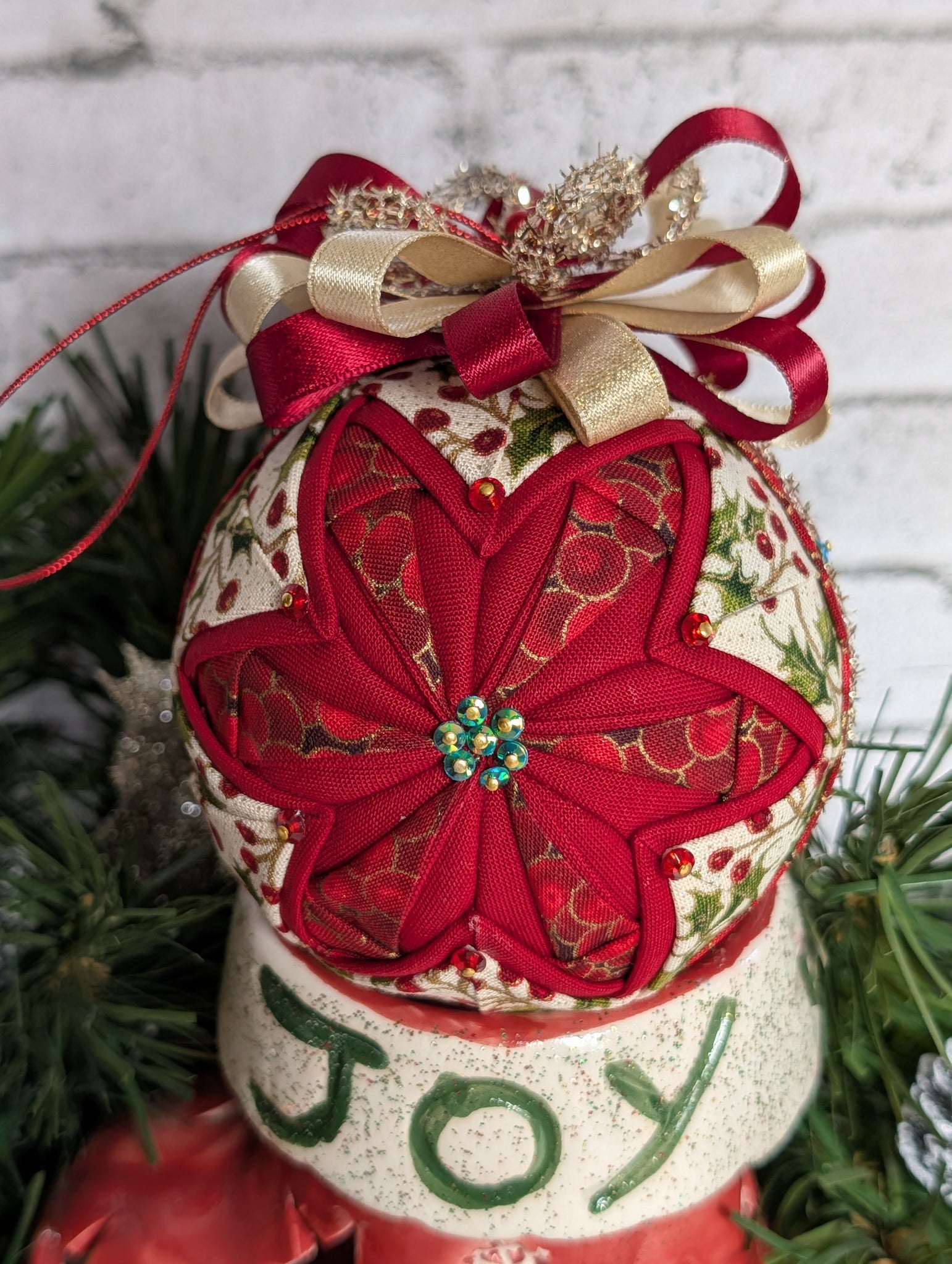 Each fabric piece used to form this ornament was individually hand folded and pinned to a 3" foam ball to create a stunningly unique and special ornament for your Christmas tree or to display as part of your holiday decor.