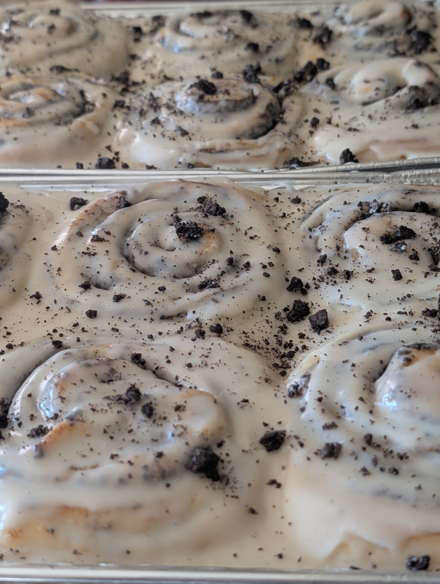 Cookies and Cream:  Flour, whole milk, sugar, vegetable oil, Oreos, butter, yeast, salt, baking powder, baking soda / Icing:  Powdered sugar, whole milk, butter.