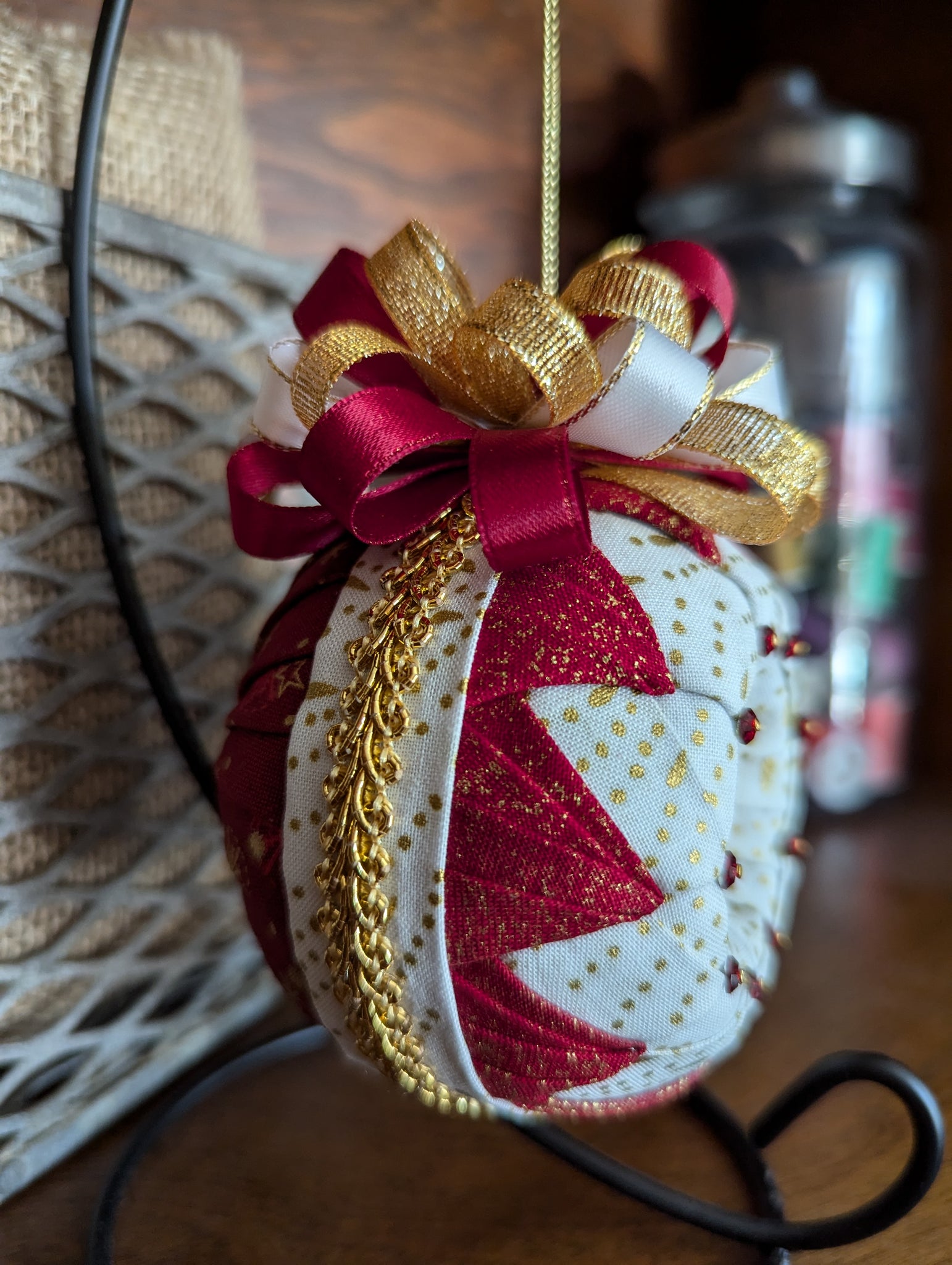 Each fabric piece used to form this ornament was individually hand folded and pinned to a 3" foam ball to create a stunningly unique and special ornament for your Christmas tree or to display as part of your holiday decor.
