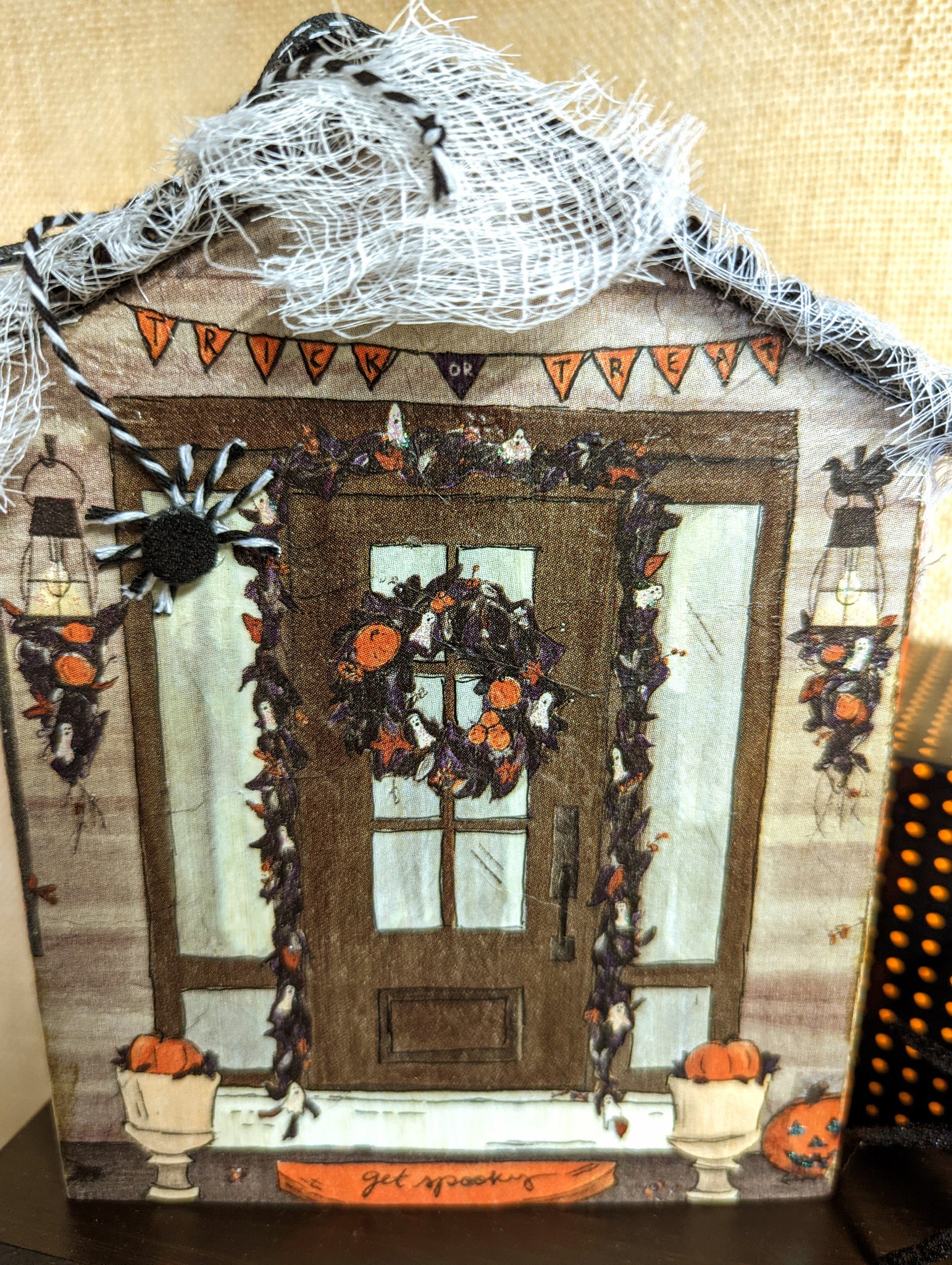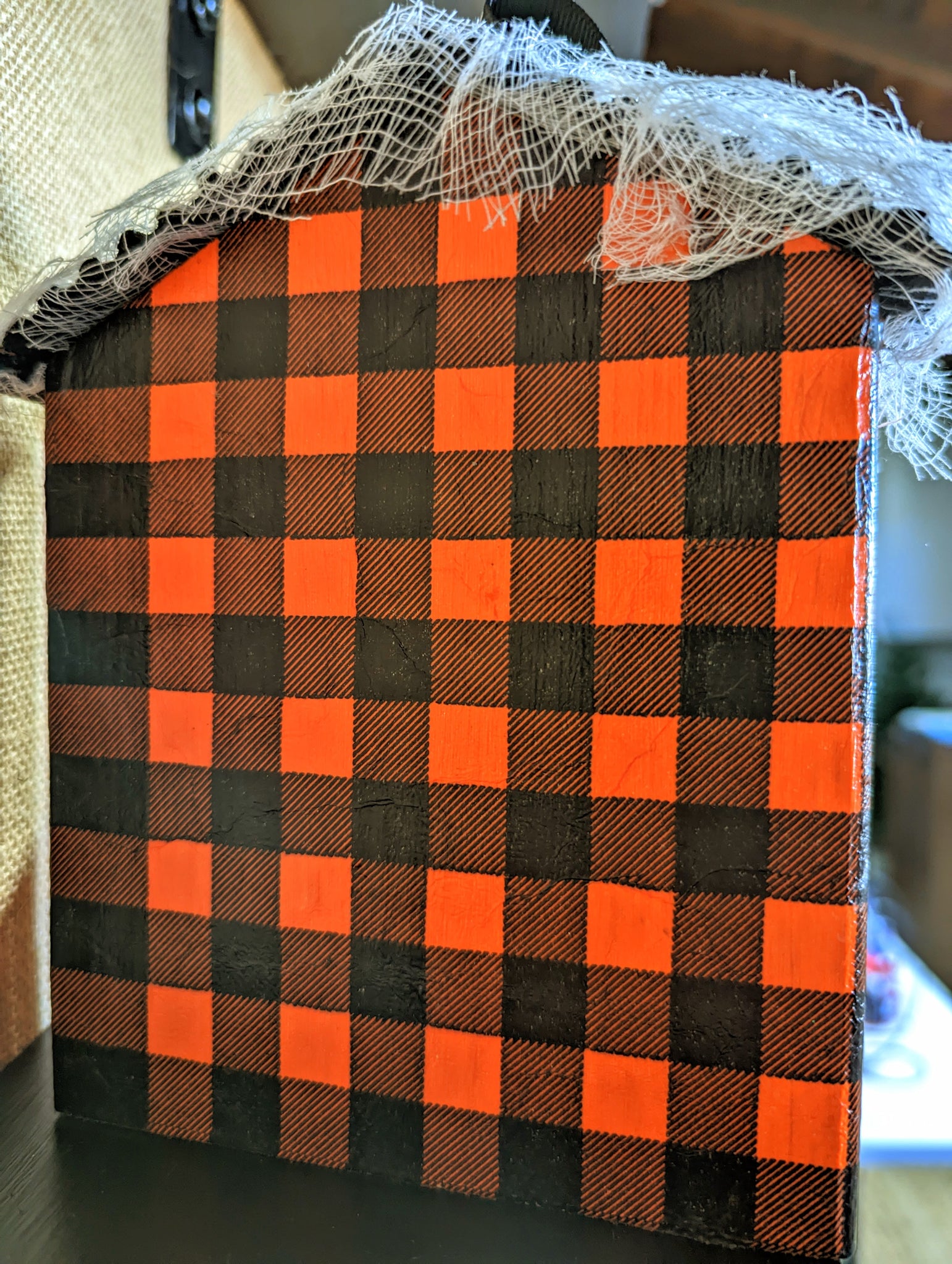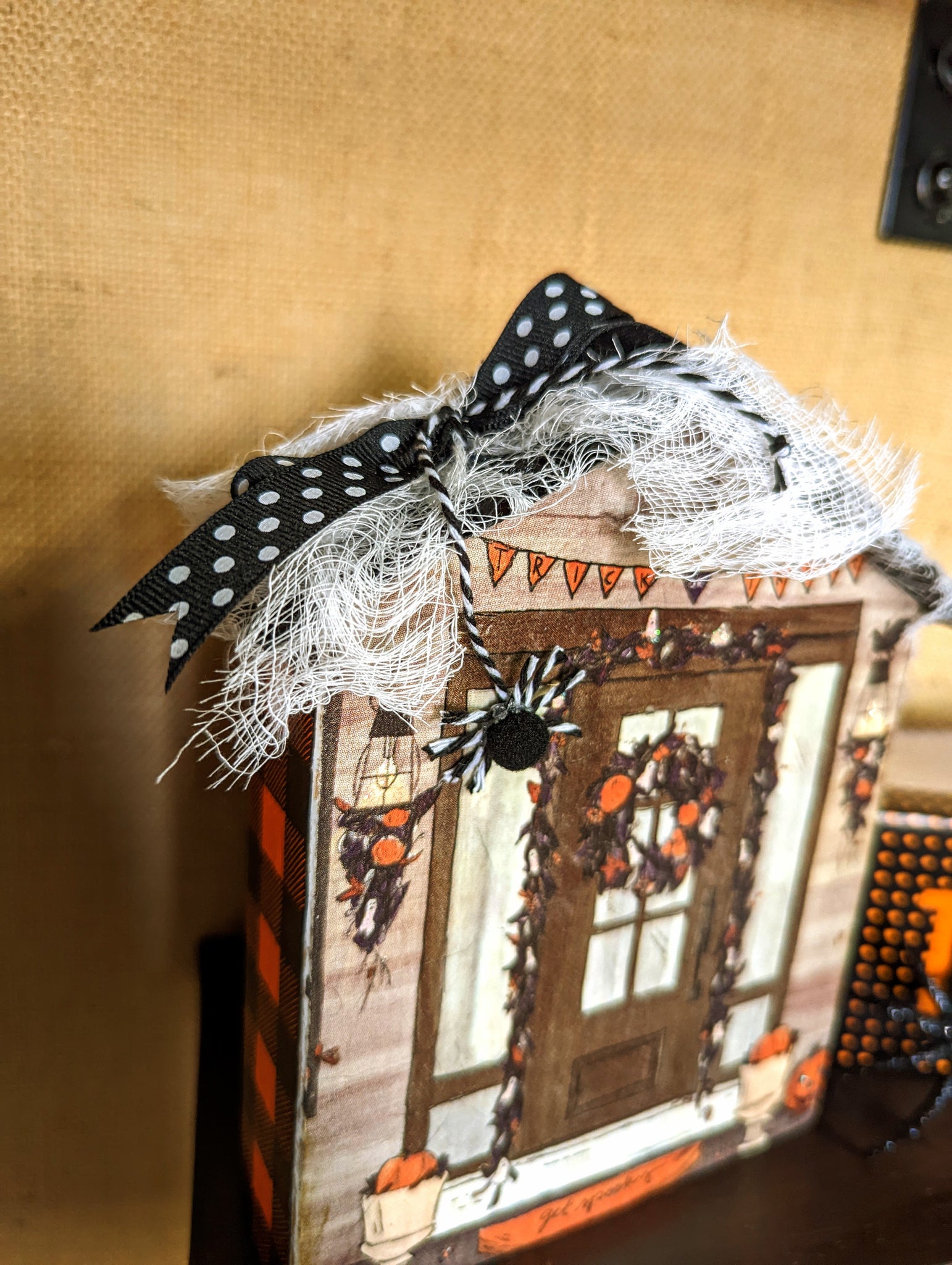 This house features a Halloween front door and porch with a Get Spooky doormat, a Trick or Treat banner, and a faux metal black roof covered with spider web-like gauze, A polka-dot bow and twine sit on top the roof with a fun little spider hanging down to the porch. Orange and black buffalo plaid surround the sides and back of the house. Look closely and you can see the lights and the cute little ghosts glittering.